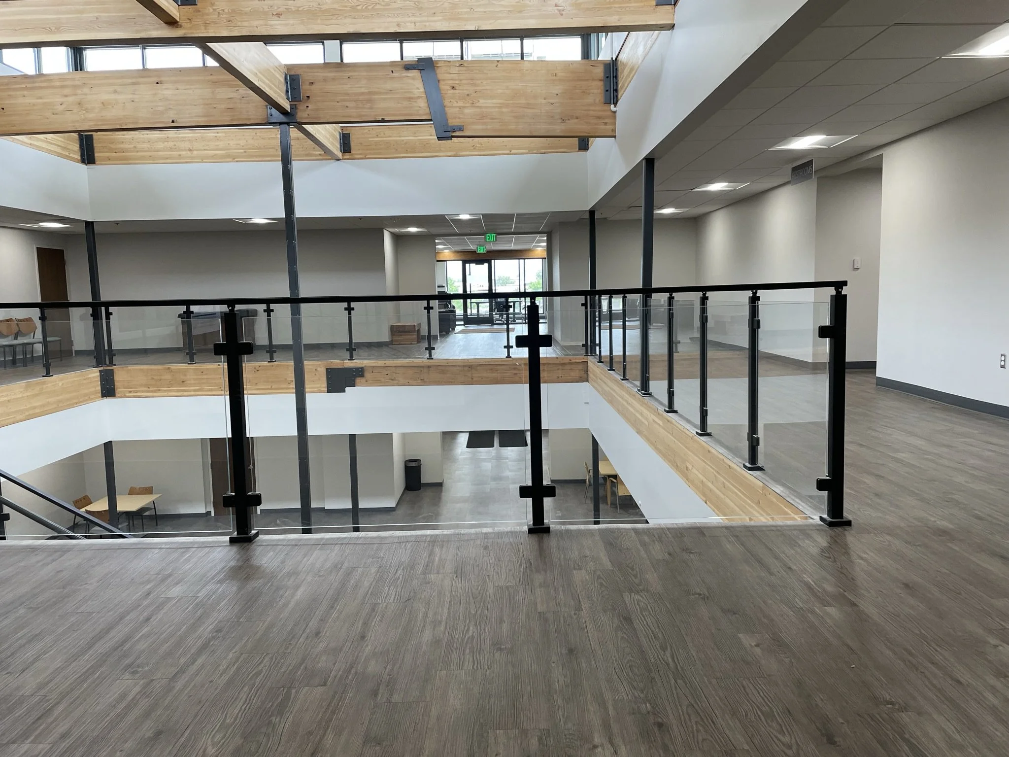 This building has been transformed from one of the most recognized athletic clubs in the region into a modern, progressive office and space to meet the needs of its current tenants. Bringing natural light into a previously windowless structure is accomplished by the two clerestory additions, framed by massive wood beams. The handcrafted staircase adds beauty and depth to the building along with the architecture of the beams in the center using repurposed sport court flooring.
